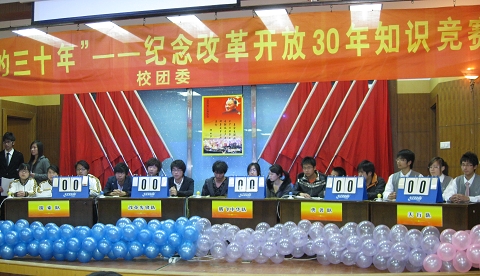 12月10日,由校团委和社科部主办的“见证•成长”改革开放系列活动之“我知道的三十年”知识将赛在1号楼3号报告厅举行。校党委宣传部部长吴海燕老师为本次大赛致了开幕辞,简略回顾了三十年的丰功伟绩,鼓励同学们努力成为今后三十年社会建设的骨干。校团委副书记刘竞老师以及各分院团委书记老师出席了本次知识竞赛,由社科部李春锋,房宪钦老师担任评委老师,为参赛队员点评。本次竞赛的主角分别为人文与旅游分院——腾飞中华队,工商管理分院——先行队,国际贸易与外国语分院——探索队,机电工程分院——勇者队,建筑与艺术分院——改革先锋队。整场比赛分为必答题——非你不可,抢答题——枪战先机,风险题——风险提速,和最后闯关题——勇往直前。