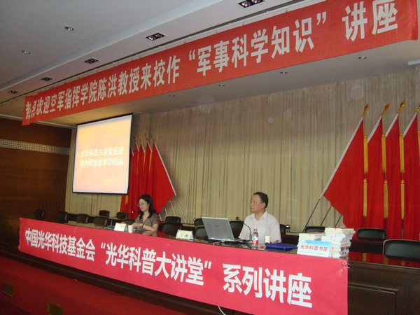 捐赠仪式结束后,由中国军事理论专家陈洪教授为全场师生作了《军用飞机与现代空中作战揭秘》的精彩讲座。他给同学们欣赏了当今世界最先进的第四代战斗机系列,演示了普加乔夫眼镜蛇机动等多种高难度飞行特技,讲述了飞行员李峰的感人故事。同时陈教授在讲座途中还不时的勉励同学们要好好学习,富国强兵,要担当起保卫国家的重任。讲座后同学们就自己感兴趣的军事相关问题向专家提问,得到了专家的详细介绍。