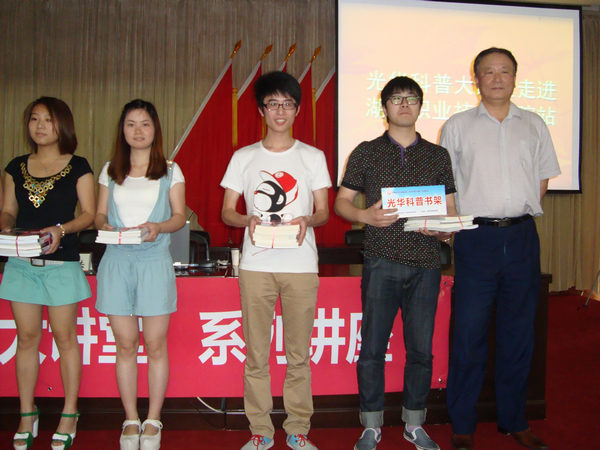 报告会上,中国光华科技基金会和科普出版社向学校捐赠了400本左右的包含了“百科探秘”、“热点聚焦”、“国际民生”、“低碳环保”等各方面的科普书籍。副校长金雁以及学生代表接受了捐赠书籍。