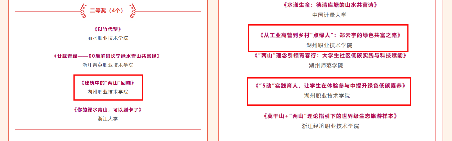 经过激烈角逐,我校建筑工程学院辅导员刘霞老师的作品《建筑中的“两山”回响》荣获微电影类二等奖;闫涵涵等老师作品《从工业高管到乡村“点绿人”:郑云宇的绿色共富之路》与沈玄武等老师的作品《“5动”实践育人,让学生在体验参与中提升绿色低碳素养》两项作品荣获入围奖。