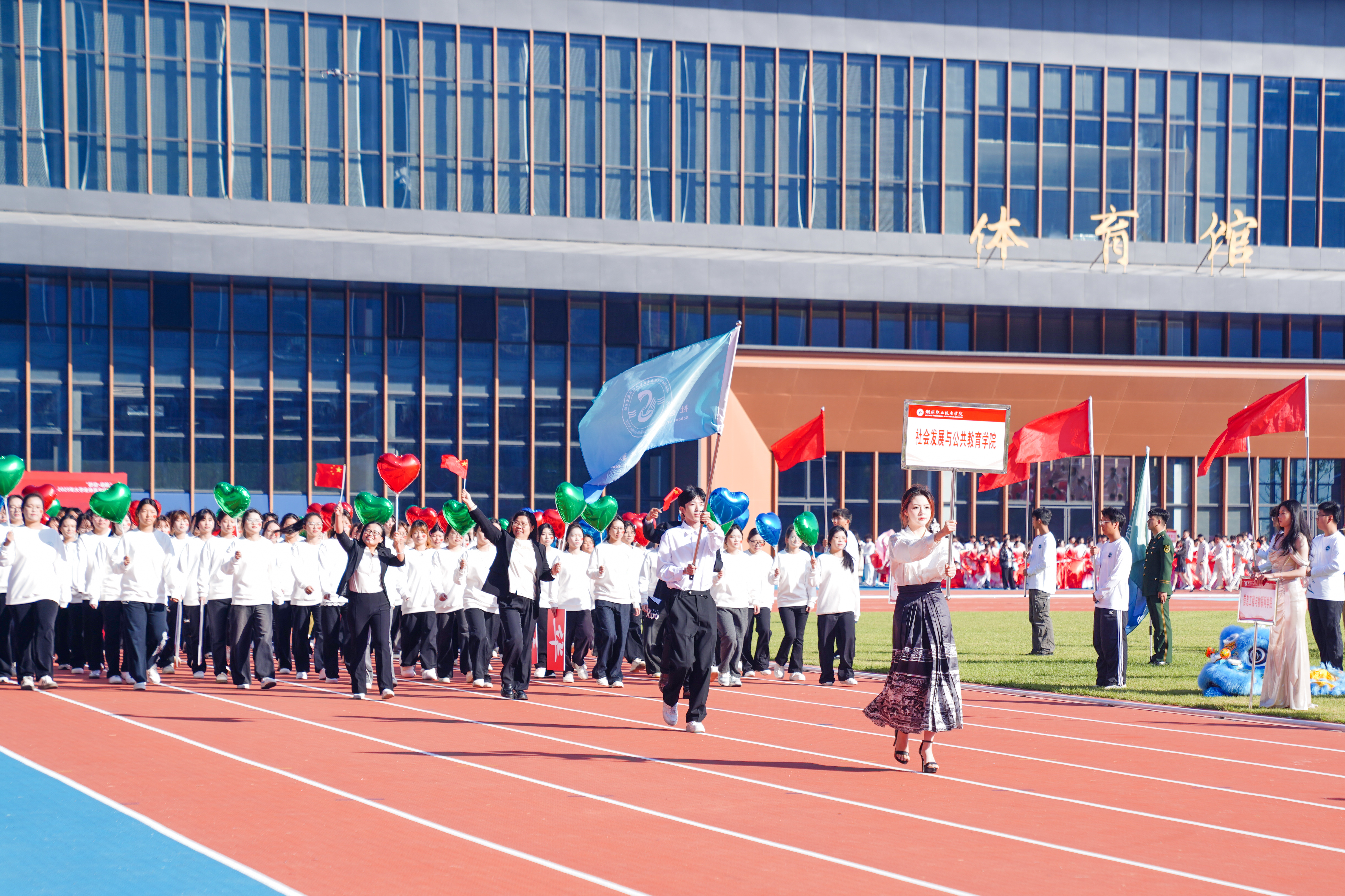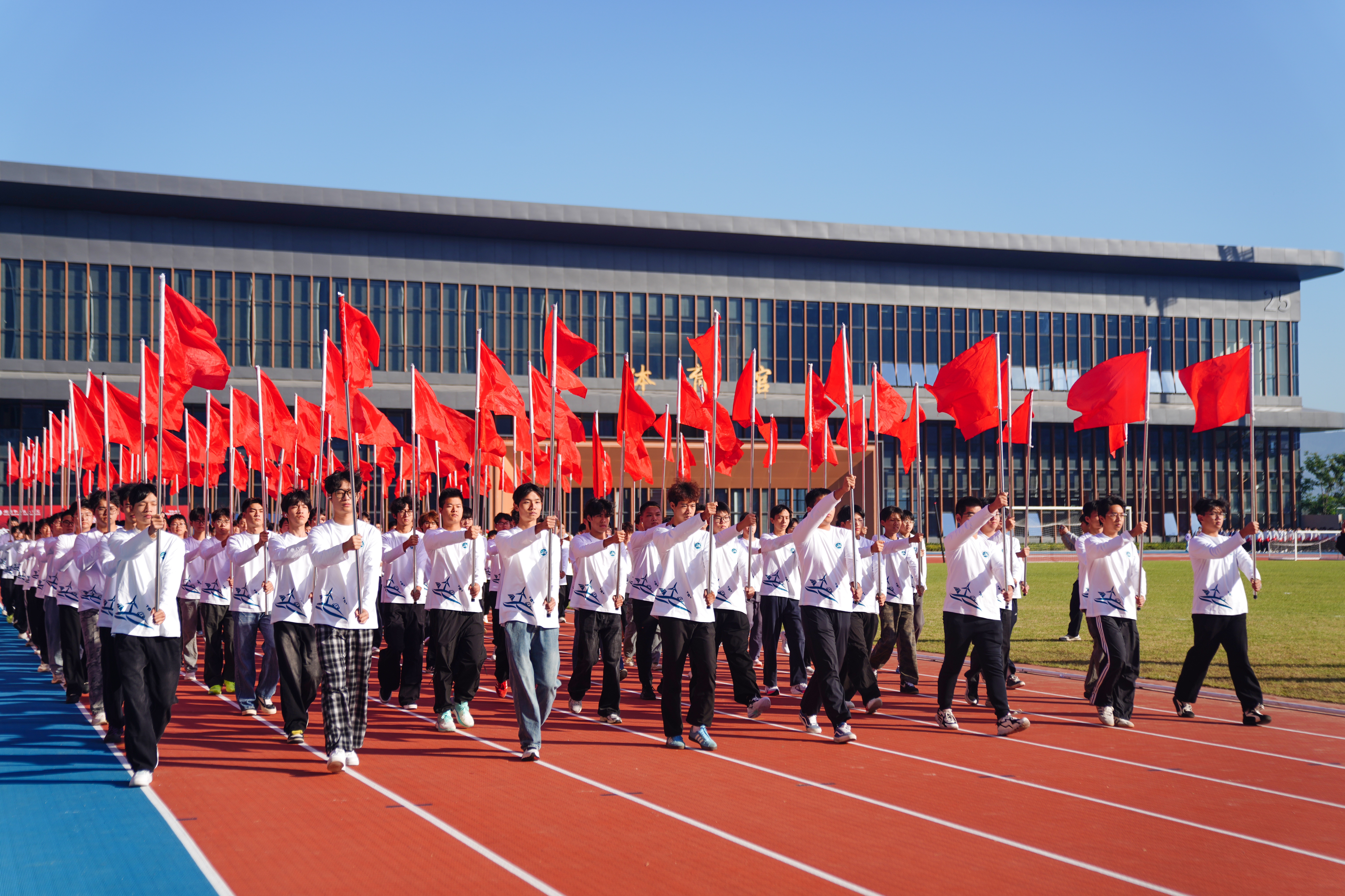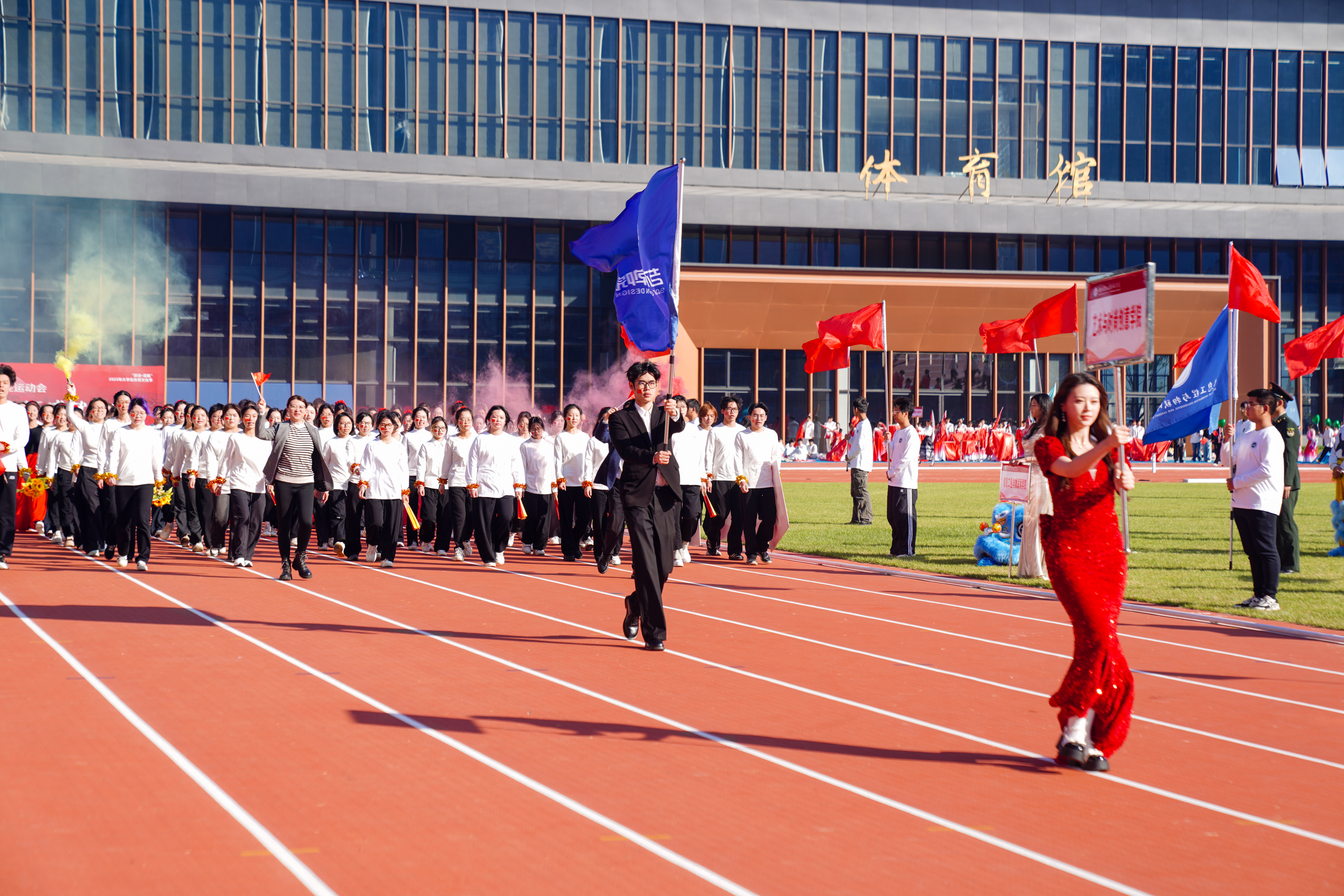 伴随着激昂的运动员进行曲,仪仗队手持国旗、校旗、运动会会旗走入会场,随后8个全日制二级学院代表队、教职工组成的方阵依次入场,接受主席台领导检阅。各代表队身着各具特色的整齐服装,彰显团结进取的院系风采,步伐铿锵、口号嘹亮,展现出飒爽的英姿和昂扬的风貌。各方阵如同色彩斑斓的画卷,依次展开精彩的节目展示,将现场的气氛瞬间点燃。入场仪式结束后,全体师生起立,升国旗、奏唱国歌。