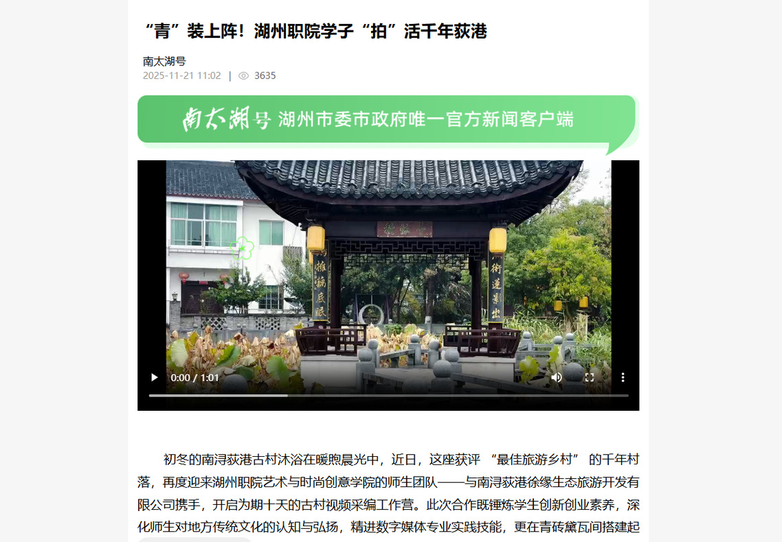 2025年11月21日《南太湖号》报道学校艺术与时尚创意学院的师生团队开启古村视频采编工作营的相关新闻。